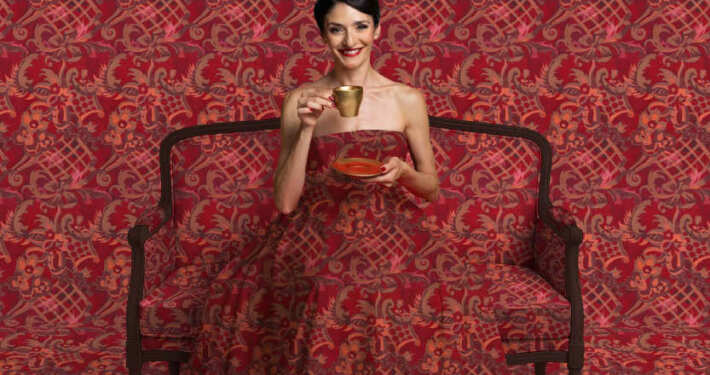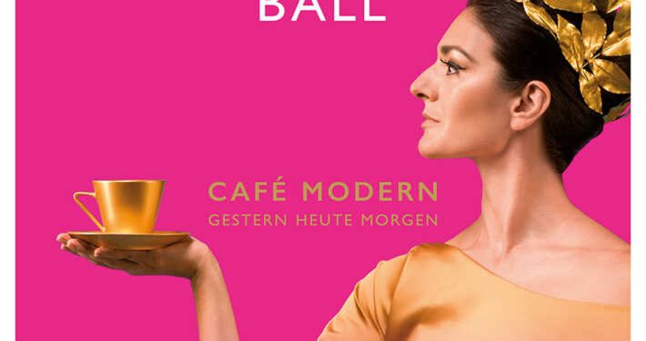 Auf dem für das Ballplakat 2026 aufgenommen Foto genießt unser Testimonial Ketevan einen Kaffee aus einer goldenen Kaffeeschale. Sie ist bereits fertig gestylt für einen Ballbesuch und trägt ein üppiges Ballkleid sowie eine klassische Ballfrisur. In der weiteren Bildebene verschmilzt sie im bekannten Stoffmuster von Reinhold Völkel mit dem Bildhintergrund.