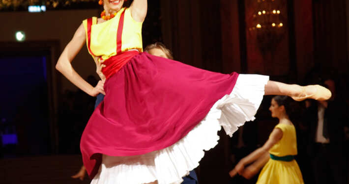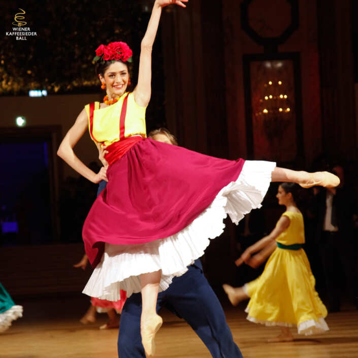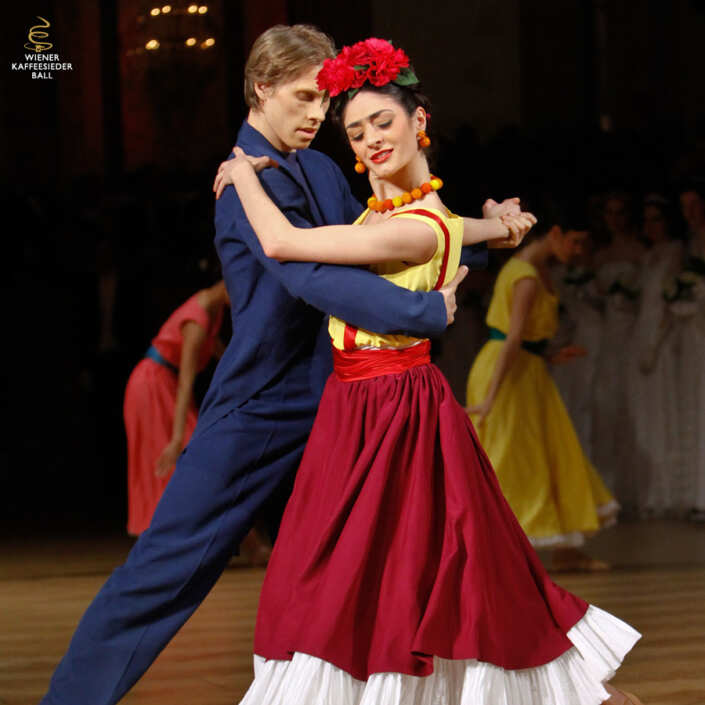 Im Zentrum des Bildes ist Ketevan Papava zu sehen, Solotänzerin des Wiener Staatballetts – und Star der Balletteinlage 2026. Sie hat bereits bei einer Vielzahl von Eröffnungen des Kaffeesiederballs mitgewirkt. Allen voran ist ihre Verkörperung von Frida Kahlo beim Mexiko Ball 2010 legendär. Vielleicht erinnern sich noch einige: Auch auf dem Ballplakat 2018 war Ketevan als Kaffeehausgöttin, mit Anklängen an die Kuppel der Wiener Sezession zu sehen.  Fotografiert wurde sie für das aktuelle Ballplakat von dem jungen und talentierten Fotograf Ashley Taylor, der regelmäßig die Tänzerinnen und Tänzer des Wiener Staatsballetts fotografiert. Mehr von seinen Arbeiten findet ihr auf Instagram unter https://www.instagram.com/_ashley.taylor_/